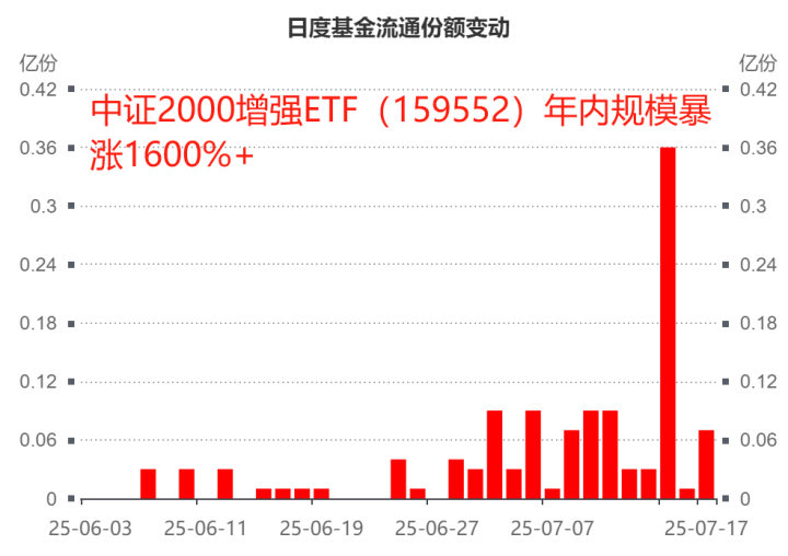 目前资金正在迅速涌入该指增ETF,10个交易日内连续保持净流入,共计超1.5亿——从6月开始,中证2000增强ETF(159552)几乎每天都在保持规模增长,今天午盘再获净申购约1300万,年内规模暴涨1600%+。