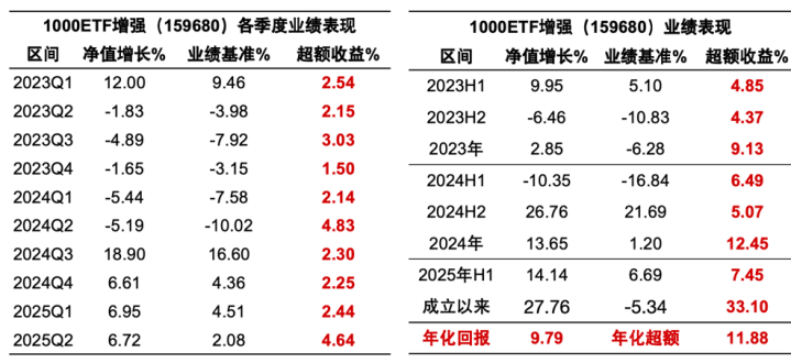 担心小盘风险的朋友可以借道超额能力比较优秀的指数ETF,像1000ETF增强(159680)这种成立以来每个季度均有超额的就是个不错的选择。截至今年上半年,这个ETF的年化超额收益是11.88%,中长期持有不用担心风险。